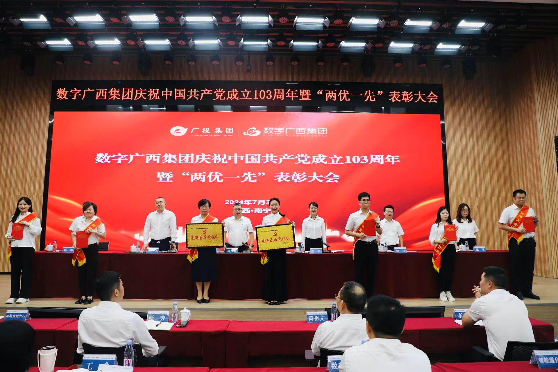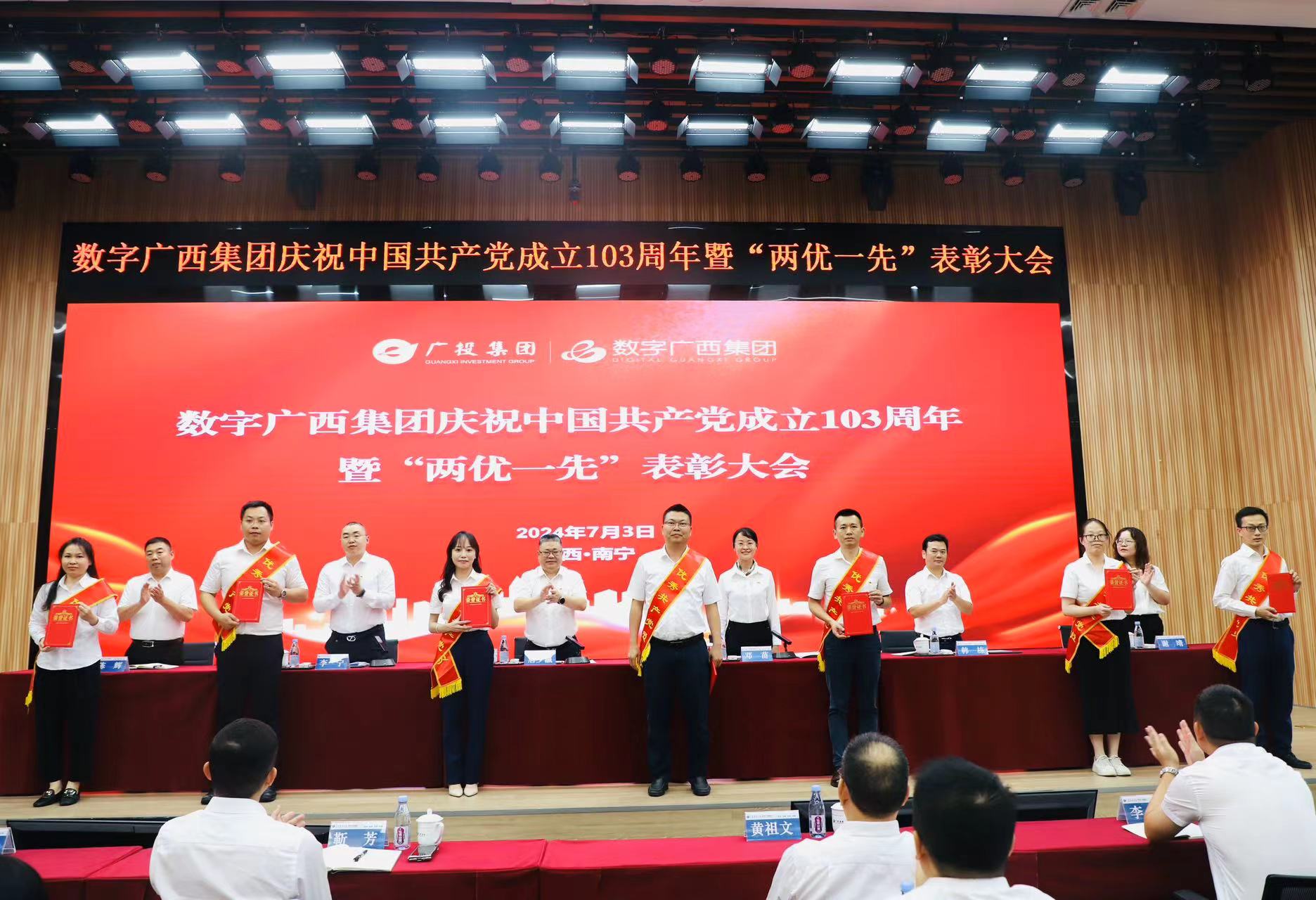 7月3日,,,尊龙时凯集团党委召开庆祝中国共产党成立103周年暨“两优一先”表彰大会,,,,集中表彰公司2023年度优秀共产党员、、优秀党务工作者、、、、先进基层党组织,,,,激励各级党组织和广大党员深入学习贯彻习近平新时代中国特色社会主义思想和习近平总书记关于广西工作论述的重要要求,,,,全面贯彻落实党的二十大精神,,弘扬伟大建党精神,,,坚定理想信念,,切实发挥基层党组织战斗堡垒作用和党员先锋模范作用,,,,在公司高质量发展中贡献更大力量。。广投集团副总经理,,,尊龙时凯集团党委书记、、、、董事长唐少瀛出席会议,,,,公司党委副书记、、职工董事、、、工会主席邓苗宣读2023年度“两优一先”表彰通报,,,,公司纪委书记、、党委委员李宁主持会议。。。。