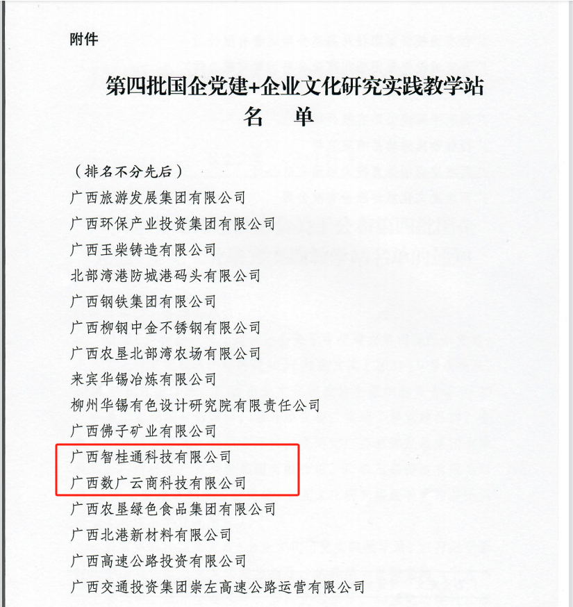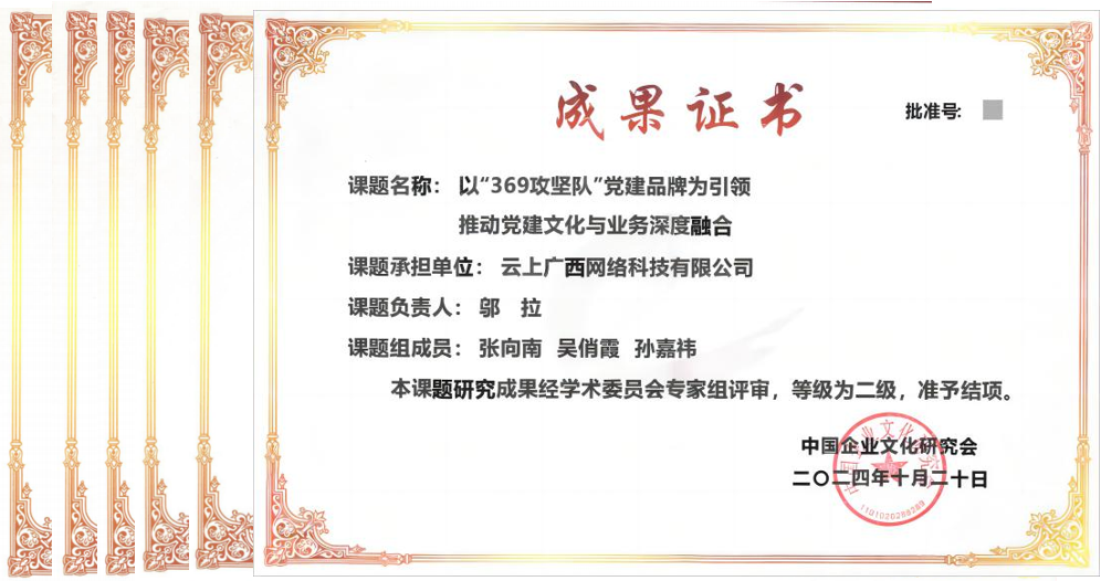 近日,,中国企业文化研究会公布了2024年度企业文化课题研究成果,,,尊龙时凯集团及旗下云上广西网络科技有限公司、、、、广西智桂通科技有限公司、、、广西数广云商科技有限公司、、、、广西数广信创信息技术有限公司、、、、广西数字经济生态产业有限公司共6个课题获评2024年度全国企业文化建设二级成果。。。广西企业文化建设协会公布广西第四批“国企党建+企业文化研究实践教学站”名单,,,广西智桂通科技有限公司、、、、广西数广云商科技有限公司获设广西第四批“国企党建+企业文化研究实践教学站”,,,党建引领作用和品牌传播效应不断增强,,企业文化特色和优势不断凸显,,,,有效助力企业高质量发展。。