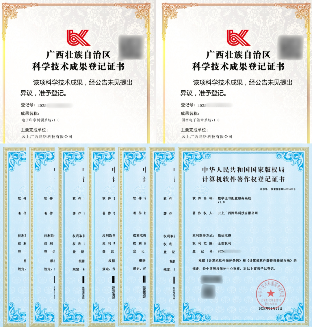 近日,,云上广西网络科技有限公司(以下简称云上广西)自主研发的电子签章系统正式通过国家密码管理局审查,,,获得《商用密码产品认证证书》。。标志着云上广西在密码技术应用和信息安全领域达到国家级标准,,为助力构建“自主可控、、安全可信、、、、运行高效”的网络环境创造了条件。。。。